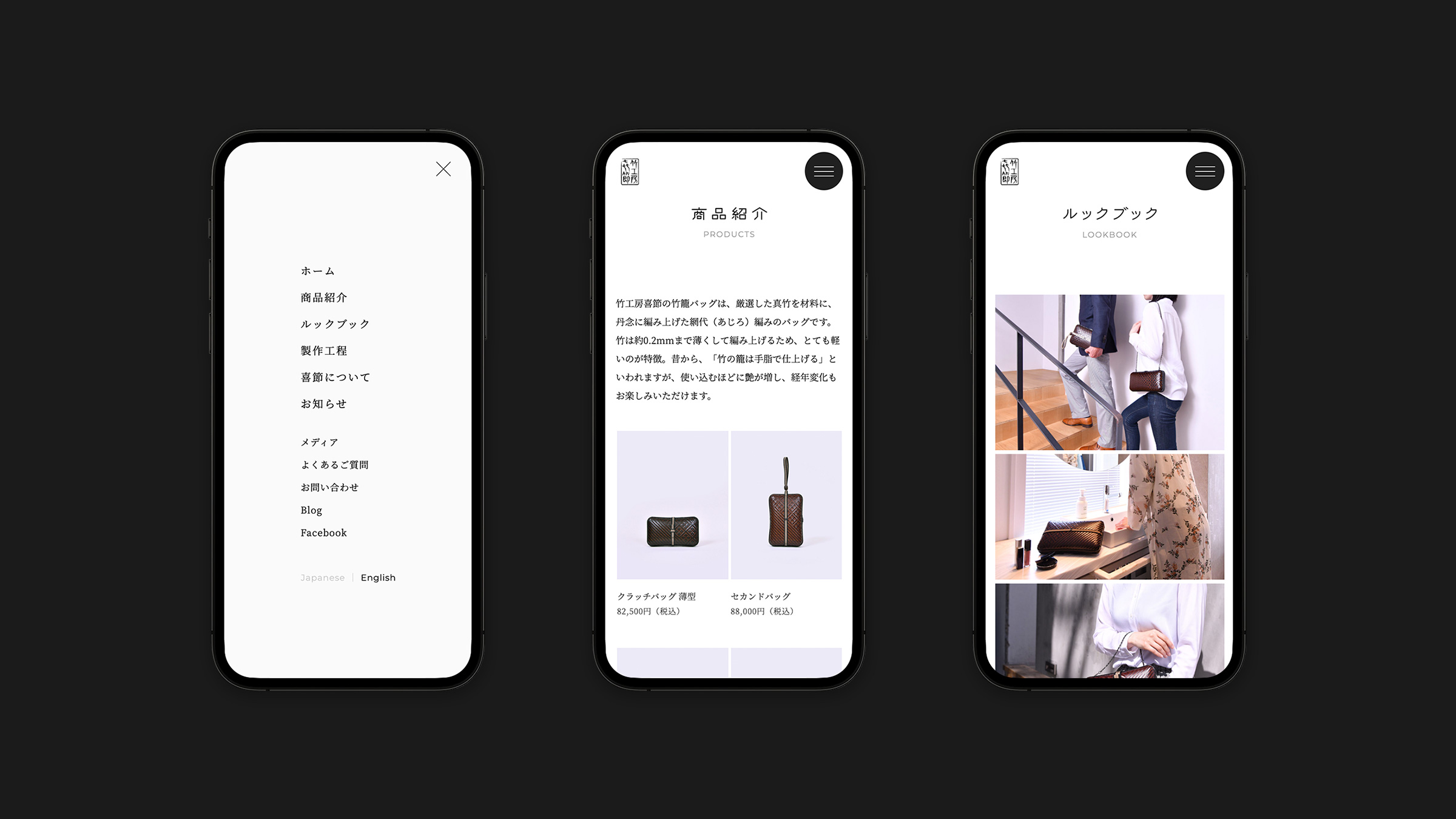 細く割り薄くへいだ竹を編む伝統技術を用いて、クラッチバッグからトランクまで、大小様々な形の竹籠バッグを製作される京都「竹工房 喜節」のWEBサイトを制作しました。