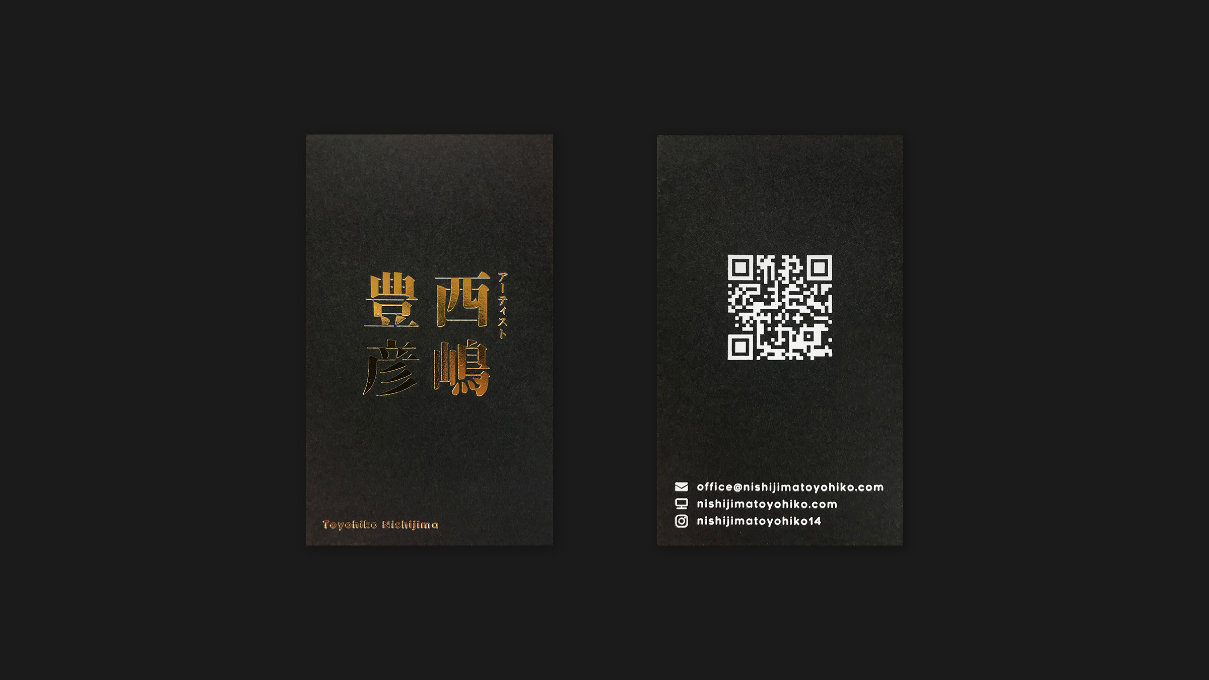 滋賀県を拠点に全国で活動されている、日本画家、西嶋豊彦さんの名刺を制作しました。お客様やクライアントの印象に残るよう、名前を特徴的にデザインし、金の箔押しで仕上げました。